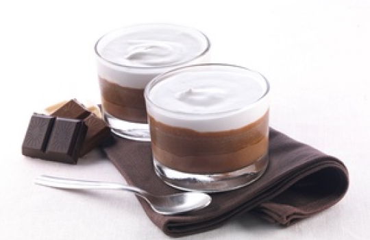 Chokoladedesserten til dig der elsker chokolade. Mørk chokolademousse, mælkechokolade og hvid chokoladecreme.