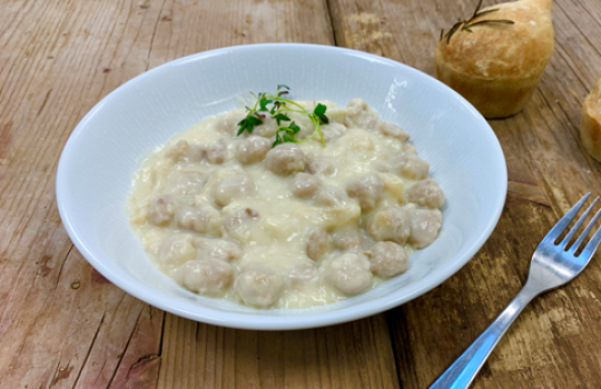 Aspargessuppen er hjemmelavet, kogt på høns og med dejligt fyld af asparges og smagfulde kødboller