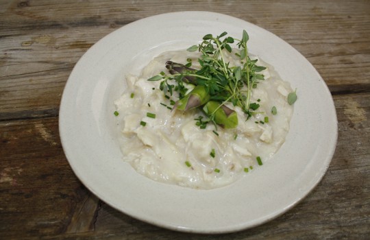 Aspargessnitter (42%) (asparges, salt, surhedsregulator (E330)) vand, PISKEFLØDE, kyllingetern (9%) (kyllingebryst, vand, salt), majsstivelse, hønsekød (3%) (plukket hønsekød, salt), bouillon (salt, hønsefedt, oksefedt, glucosesirup, aroma, kylling, syre (E330, E270, E327), krydderier (hvid peber, gurkemeje), karamesukker, maltodextrin, rosmarinekstrakt).