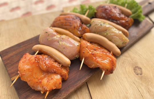 Det dobbelte grillspyd består af 3 stk. kyllingebryst med hver sin marinade adskilt af grillpølser. Når grillspyddet er grillet, deles det på langs, så der bliver til to grillspyd.