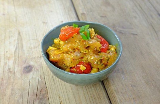 Kalkunbryst i tern (82%), blandede peberfrugter (8%), løg (4%), hvidløg, peanuts (JORDNØDDER, palmeolie, salt), marinade (delvist hærdet rapsolie, salt, tomat, BYGMALTekstrakt, hydr. veg. protein, krydderier og krydderiekstrakter, sukker).