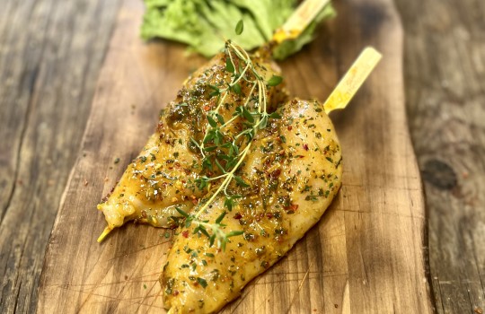 Grilles ved "direkte varme" i ca. 6-7 minutter på hver side eller steges på en varm pande eller i en forvarmet ovn ved 175°C til en kernetemperatur på 75°C. Lad spyddet hvile et par minutter inden udskæring.