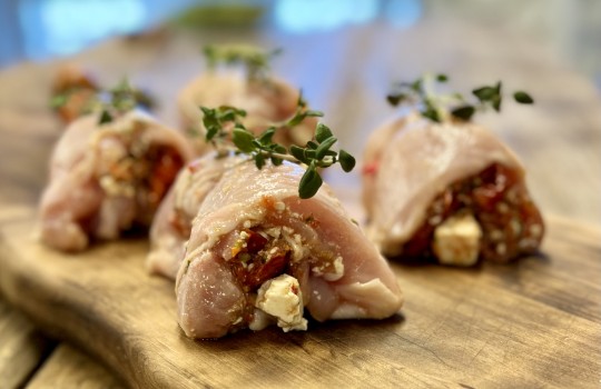 Vores kyllingeruller er udbenet kyllingelår med fyld af soltørrede tomater, hvidløg, persille og feta.