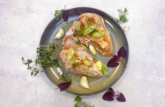 Vi fyldt et kyllingebryst supreme med hvidløgssmør og forårsløg.