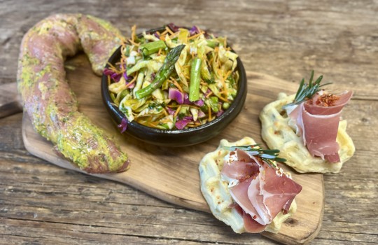 - 2 stk. kartoffelvaffel med hvidløgssmør og parmaskinke