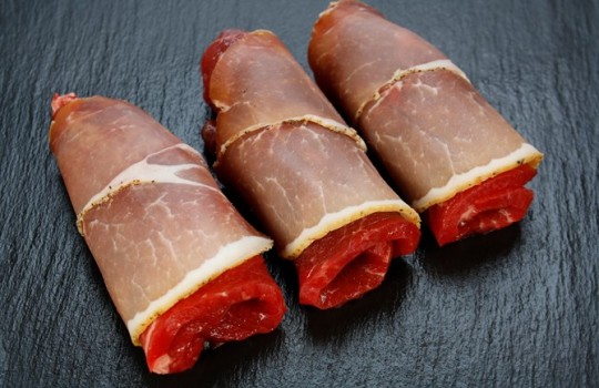 Ingredienser: Okseinderlår (80%), spegeskinke (16%) (Skinke, salt, sukker, dextrose, krydderier, antioxidant (E301), konservering (E250, E252), røget), pesto (4%) (basilikum, solsikkeolie, LAKTOSE, CASHEWNØDDER, PARMASANOST, salt, hvidløg, surhedsregulator, (E270), naturlig basilikumaroma).