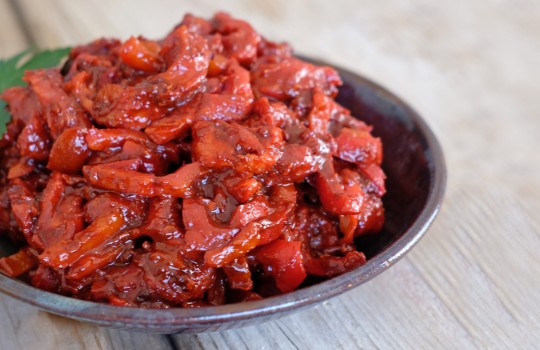 Okseinderlår i strimler (77%), paprika i strimler (15%) (rød peberfrugt, eddike, glucose-fructosesirup, balsamicoeddike (eddike, druemostkoncentrat, farve (E150d)), sukker, salt), marinade (8%) (delvis hærdet rapsolie, krydderier og krydderiekstrakter (løg, hvidløg, spidskommen, paprika, chili), salt, dextrose, tomatpulver, gærekstrakt).