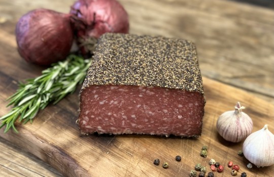 Peberbloksalami er vendt i en mild peberblanding, der herved giver salamien en god og dyb smag af peber.