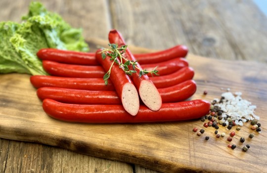 Vores hotdogpølser med rød farve, højt kødindhold og en rund, god smag.