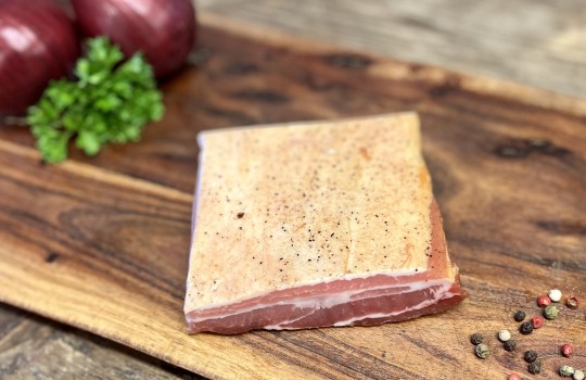 Vores tørsaltet bacon er håndsaltet, tørret og røget. Tørsaltet bacon kan steges mere sprødt end traditionelt bacon og "sprutter" mindre på panden, fordi saltningen har trukket vandet ud af kødet. Vi er meget stolte af vores tørsaltede bacon, og betragter den som en delikatesse.