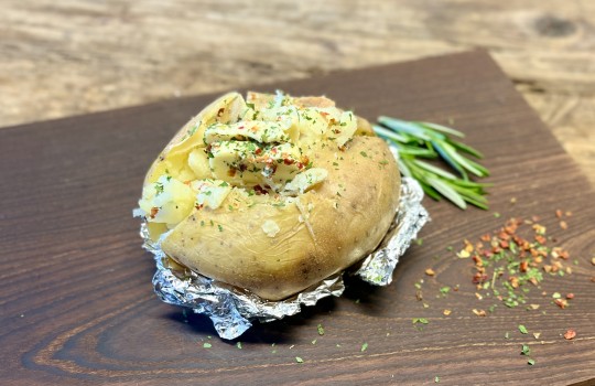 - Til bøffen: Servér den bagte kartoffel med en klat hjemmelavet kryddersmør og en saftig steak for en klassisk kombination.