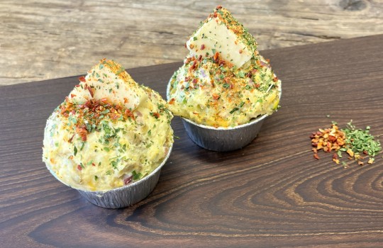Oplev en smagsoplevelse ud over det sædvanlige med vores Knuste Kartofler. Denne klassiske ret tager de bedste nye kartofler og løfter dem med cremet flødeost, sprødstegt bacon, søde løg, saftige peberfrugter og smeltende cheddarost. Toppet med en skive aromatisk hvidløgssmør og et drys frisk purløg, skaber retten en perfekt balance mellem fyldige og friske smagsnuancer. Det er en hyldest til dansk gæstfrihed og traditionelt håndværk, serveret med et moderne twist.