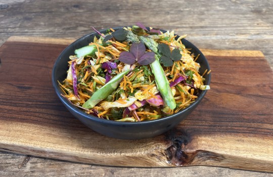 Vores hjemmelavede spicy kålsalat kombinerer sprøde teksturer med en perfekt afbalanceret, krydret eftersmag. Salaten består af lilla og almindelig spidskål, grønne asparges, gulerødder, dild og persille, der tilsammen skaber et farverigt og velsmagende udtryk. Den er vendt i en fyldig dressing af chili pasta og citron vinaigrette, der tilfører friskhed og et lille kick.