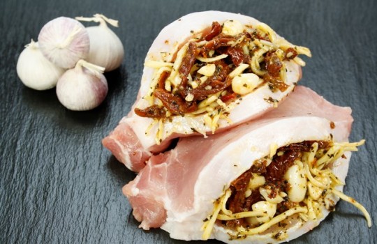Lad hver bid glæde dine smagsløg med vores koteletter med fyld. Disse benfrie koteletter er omhyggeligt udvalgt og fyldt med en uimodståelig kombination af revet mozzarella, syltet hvidløg, soltørret tomat og en frisk grøn pesto. Smagene mødes i en harmonisk balance, der gør hver kotelet til en kulinarisk fornøjelse, som både du og din familie vil elske.