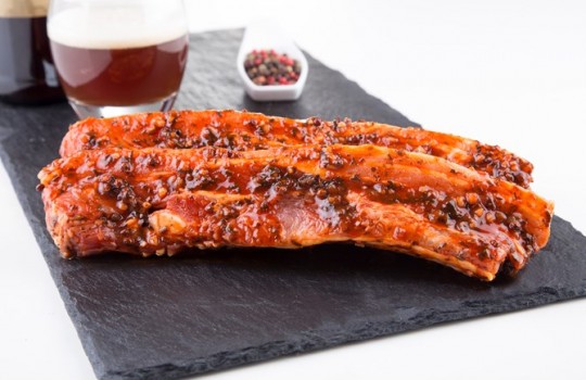 Skiver af svinebrystflæsk (91%), marinade (9%) (mørk øl (40%) (vand, BYGMALT, humleestrakt)), vand, salt, krydderier, eddike, sukker rapsolie, sennep (SENNEPSKORN, eddike, vand, salt), BYGMALT-ekstrakt, karamel, modificeret stivelse, naturlig aroma, MÆLKEPROTEIN, fortykningsmiddel (E415), MÆLKESUKKER).